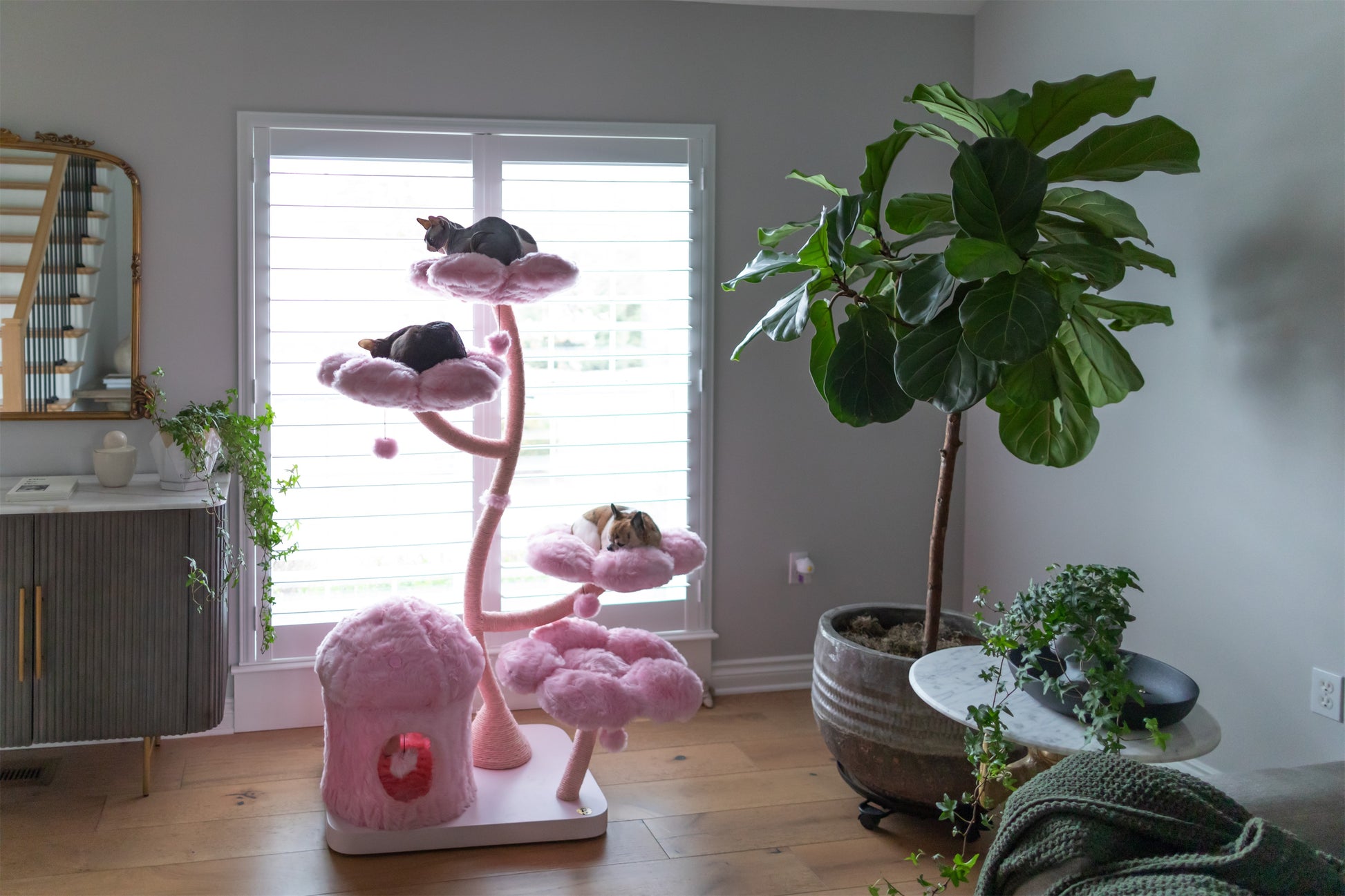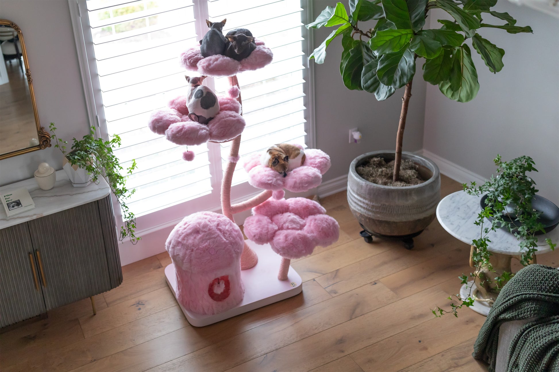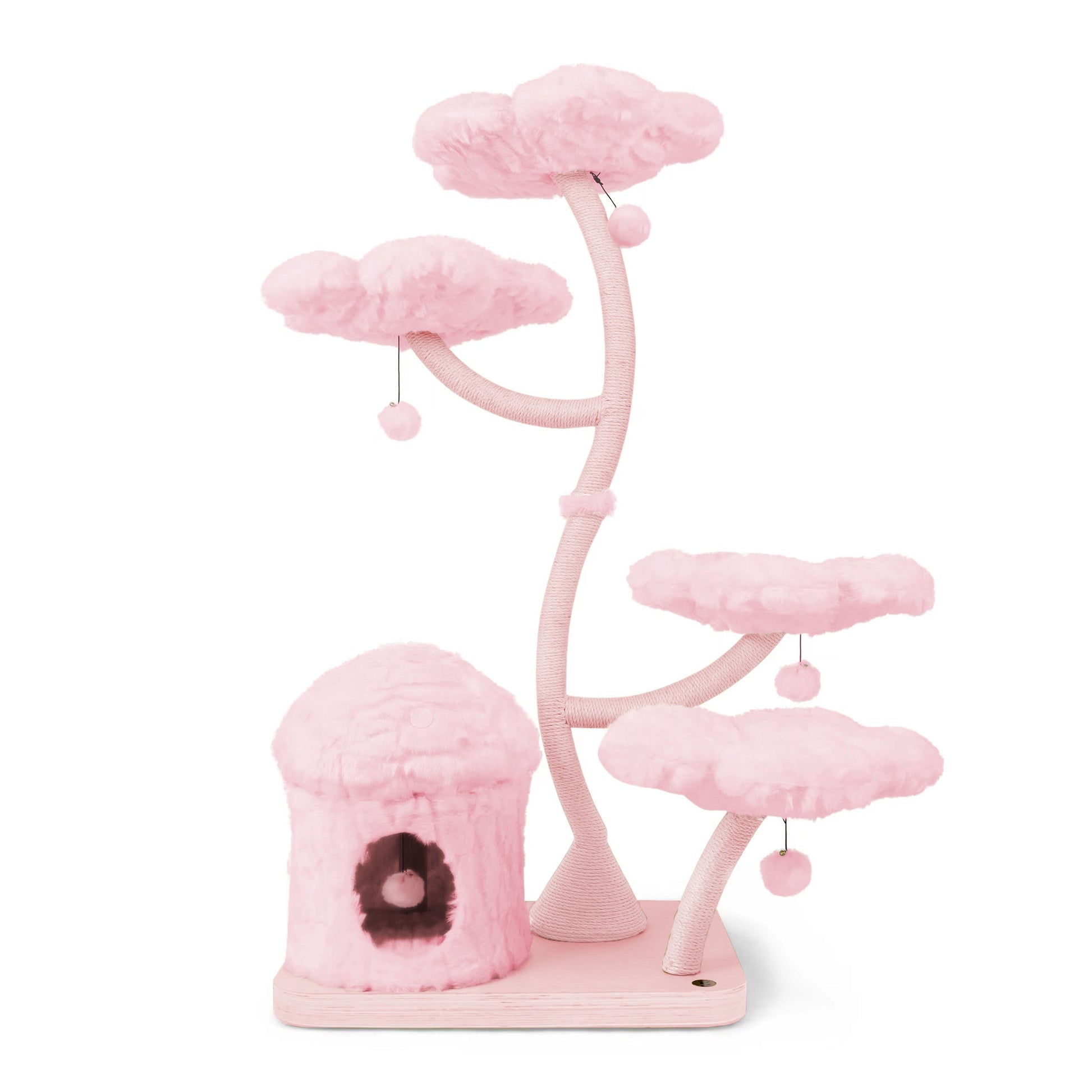Features This unique floral cat tree comes with a firm base plate to assure the safety of your cat. It also comes with a sturdy and uniquely curved trunk wrapped entirely with sisal rope. This trunk connects the base to 4 luxurious flower beds which are the BIGGEST on the market, which offer space and comfort to all cats. Eden has a cozy and private mushroom house, and five dangly pom-pom toys with bells. This cat tree is suitable for cat resting, climbing, and playing β a great alternative for leaving your cat alone without having to worry about damaged furniture. We provide your cat with a sisal rope post for them to have fun while leaving your sofa and tiles free of scratches.
