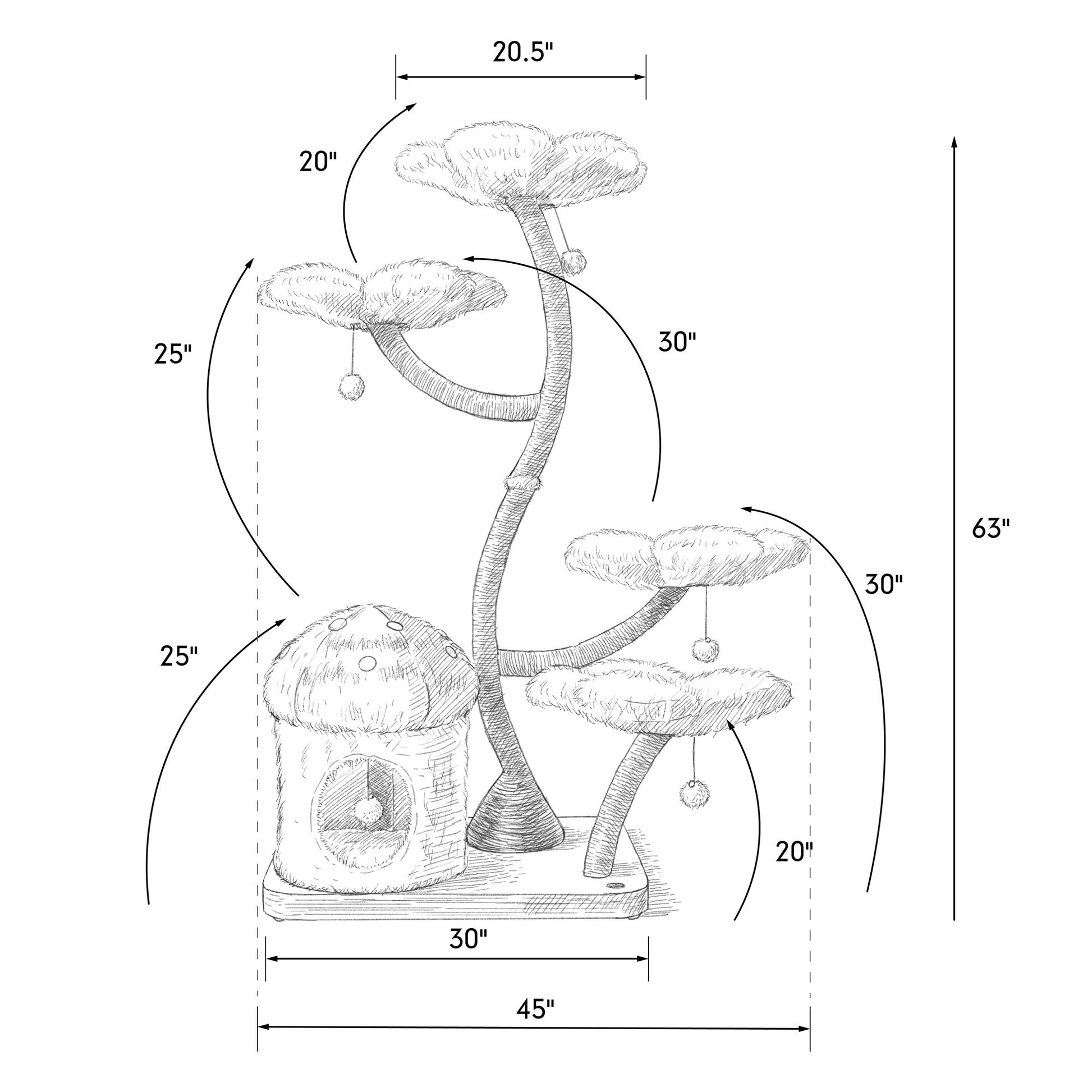 This modernized cat tree consists of four flower beds -varying appropriate heights ranging up to 63β- one enclosed, cozy, private mushroom house with a dangly pom-pom toy attached. Our products are designed and tested for adult cats, kittens, and senior cats. ***Our cat trees are the BIGGEST on the market, offering spacious and comfortable amenities for even the most particular felines.