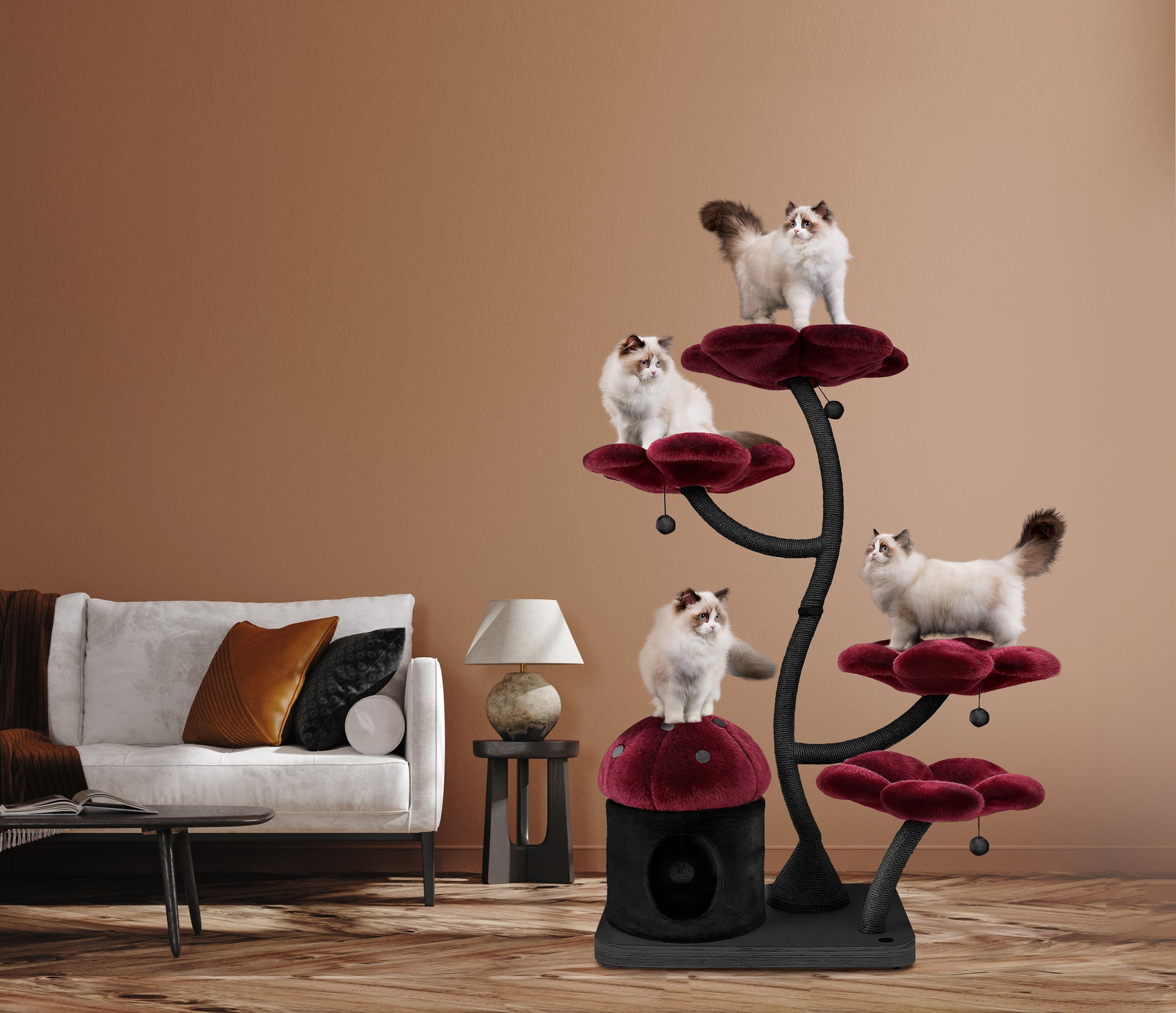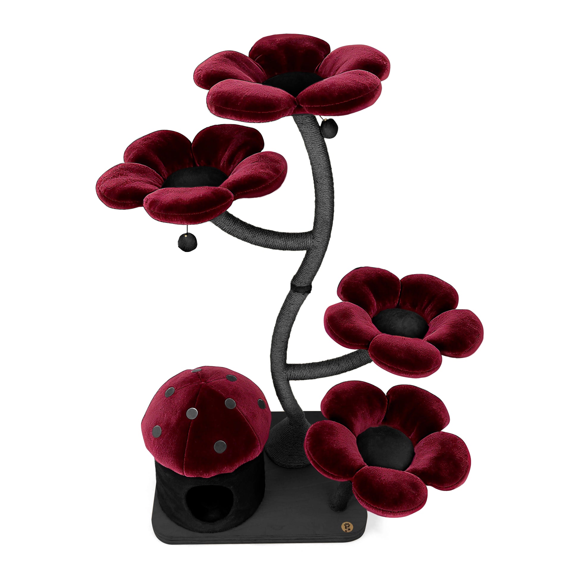 Features This unique floral cat tree comes with a firm base plate to assure the safety of your cat. It also comes with a sturdy and uniquely curved trunk wrapped entirely with sisal rope. This trunk connects the base to 4 luxurious flower beds which are the BIGGEST on the market, which offer space and comfort to all cats. Eden has a cozy and private mushroom house, and five dangly pom-pom toys with bells. This cat tree is suitable for cat resting, climbing, and playing — a great alternative for leaving your cat alone without having to worry about damaged furniture. We provide your cat with a sisal rope post for them to have fun while leaving your sofa and tiles free of scratches.