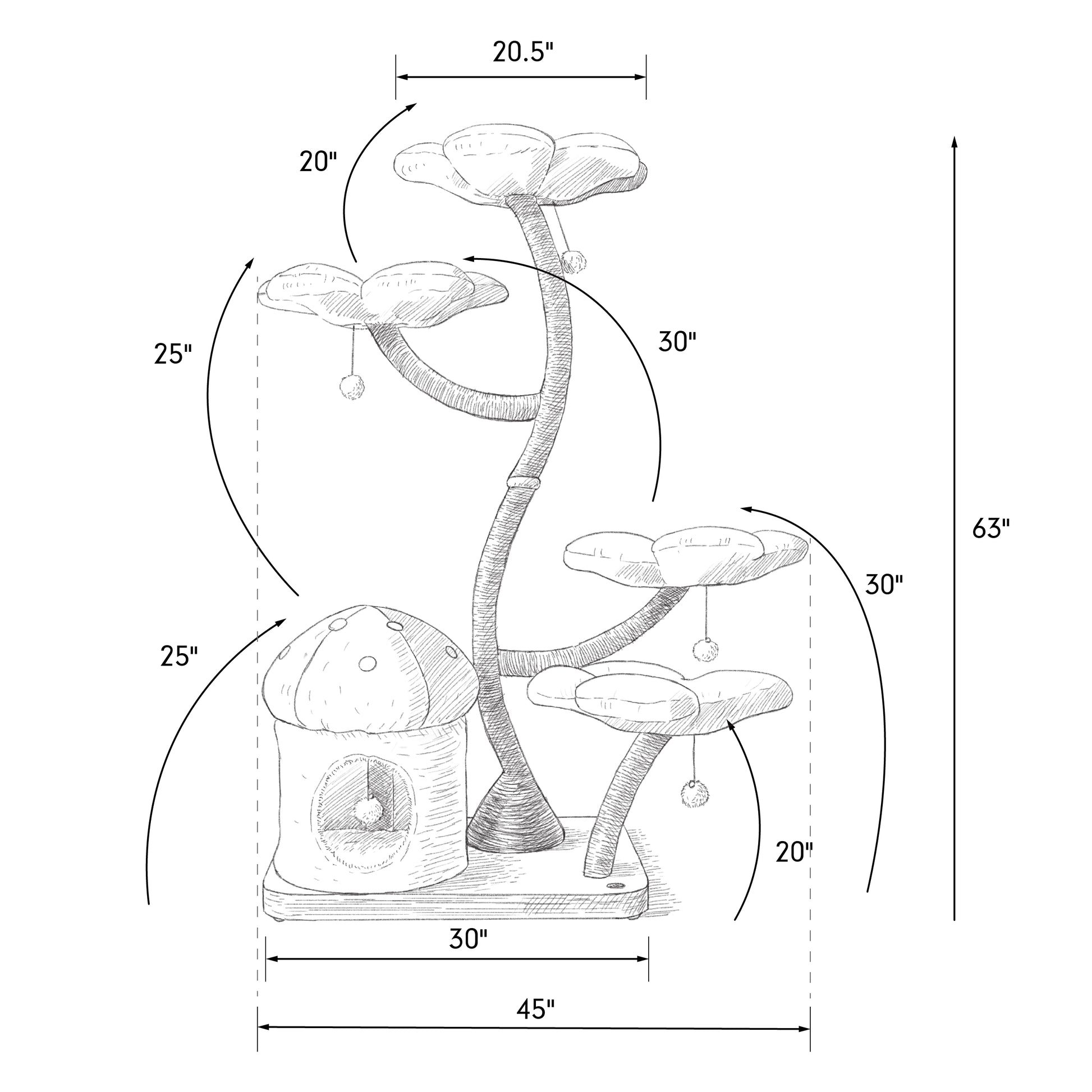 This modernized cat tree consists of four flower beds -varying appropriate heights ranging up to 63”- one enclosed, cozy, private mushroom house with a dangly pom-pom toy attached. Our products are designed and tested for adult cats, kittens, and senior cats. ***Our cat trees are the BIGGEST on the market, offering spacious and comfortable amenities for even the most particular felines.