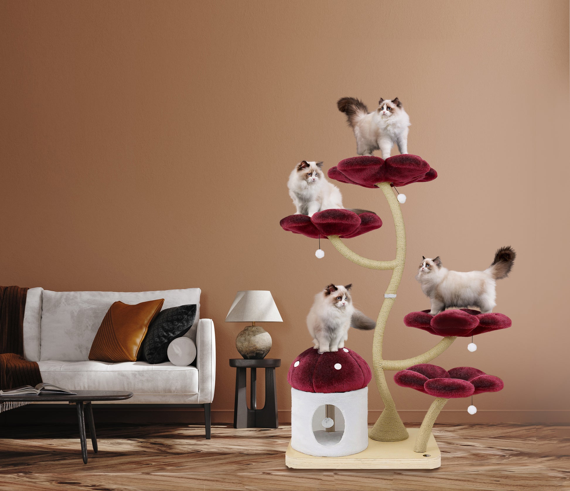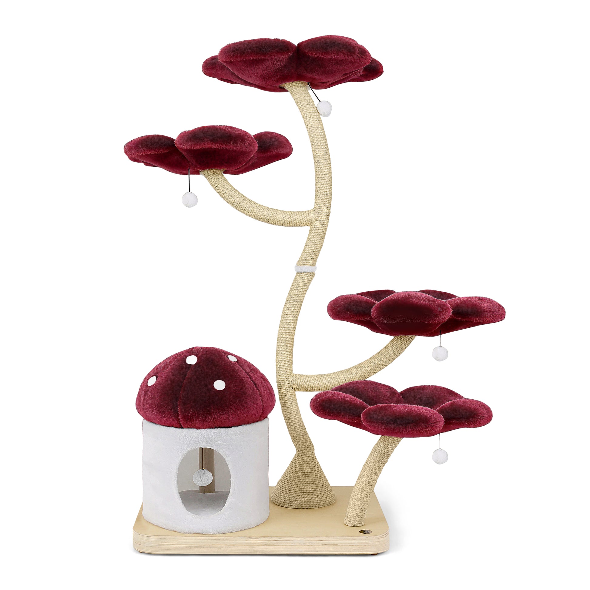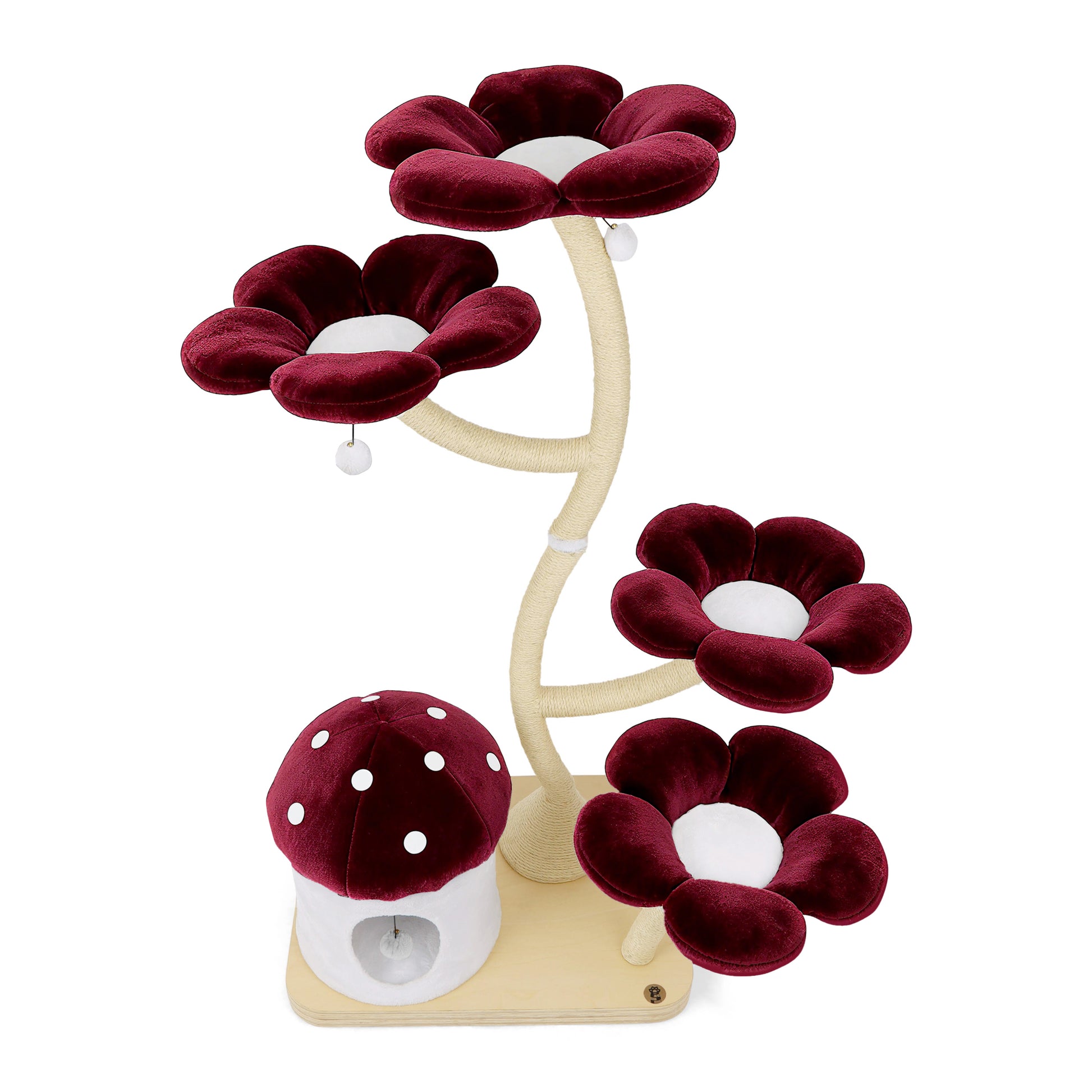 Features This unique floral cat tree comes with a firm base plate to assure the safety of your cat. It also comes with a sturdy and uniquely curved trunk wrapped entirely with sisal rope. This trunk connects the base to 4 luxurious flower beds which are the BIGGEST on the market, which offer space and comfort to all cats. Eden has a cozy and private mushroom house, and five dangly pom-pom toys with bells. This cat tree is suitable for cat resting, climbing, and playing — a great alternative for leaving your cat alone without having to worry about damaged furniture. We provide your cat with a sisal rope post for them to have fun while leaving your sofa and tiles free of scratches.