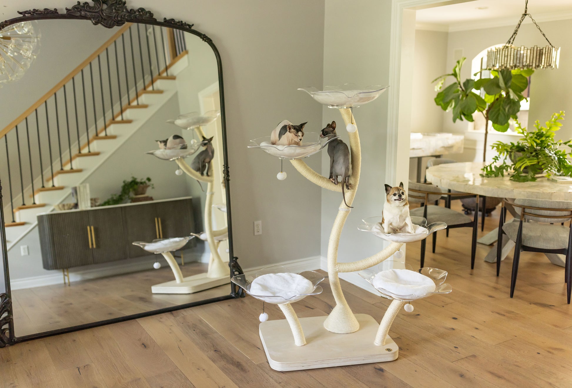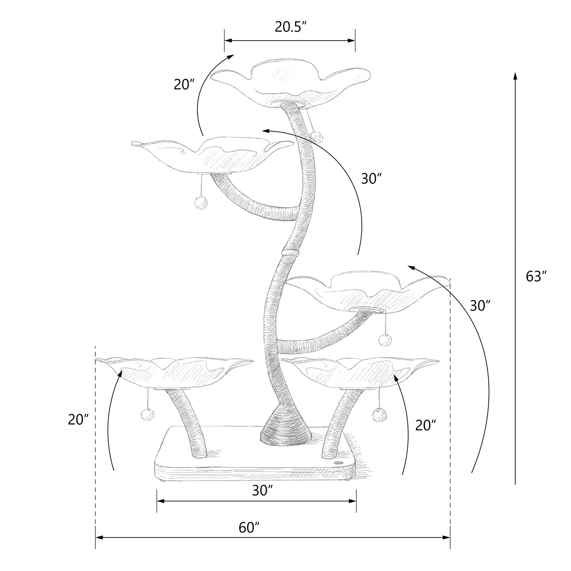 This modernized cat tree consists of five flower beds of varying heights, up to 63 inches. Each flower bed comes with our machine-washable plush cushions and hanging pom-pom toys below for a bit of amusement between catnaps. Our products are designed and tested for adult cats, kittens, and senior cats. ***Our cat trees are the BIGGEST on the market, offering spacious and comfortable amenities for even the most particular felines.