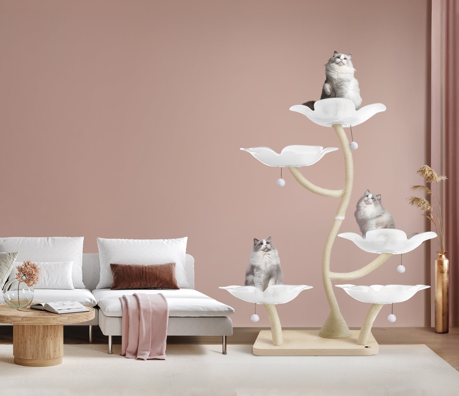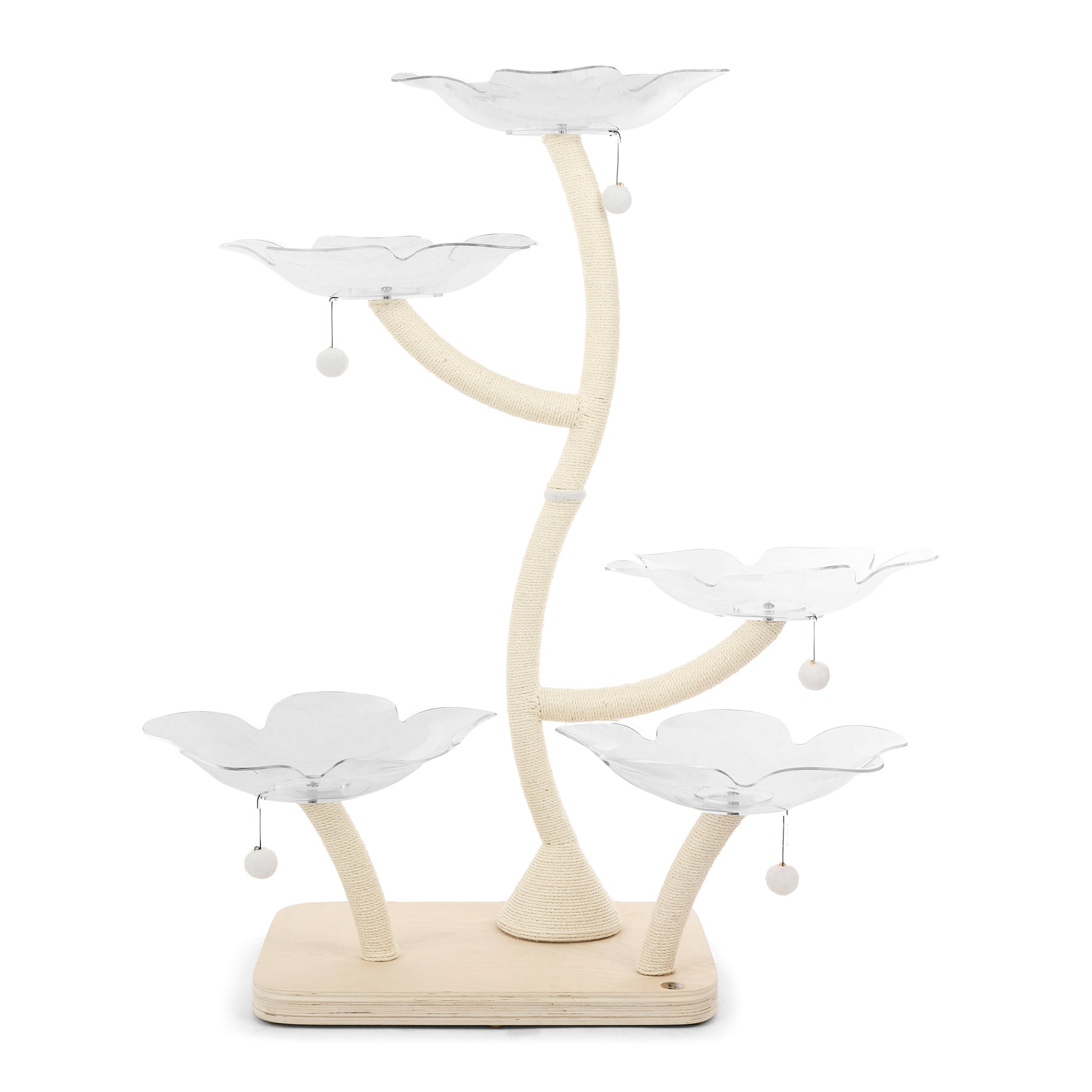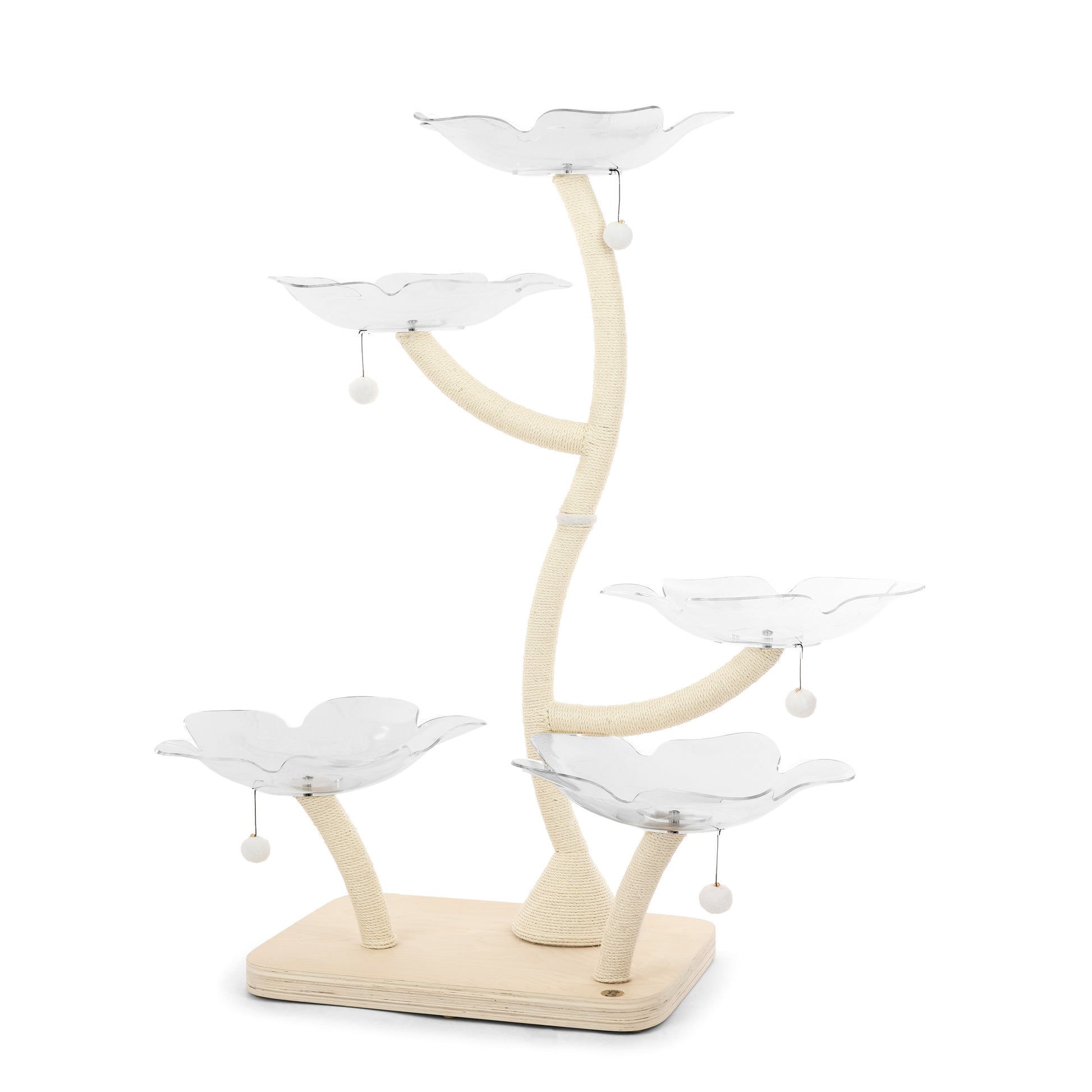 Features This unique floral cat tree comes with a firm base plate to assure the safety of your cat. It also features a sturdy and uniquely curved trunk wrapped with 80 inches of scratching rope. This trunk connects the base to five luxurious flower beds, which are the BIGGEST on the market, offering space and comfort to all cats. This cat tree is suitable for resting, climbing, and playingβan excellent alternative for leaving your cat alone without worrying about damaged furniture. We provide your cat with a sisal rope post for them to have fun while leaving your sofa and tiles free of scratches.