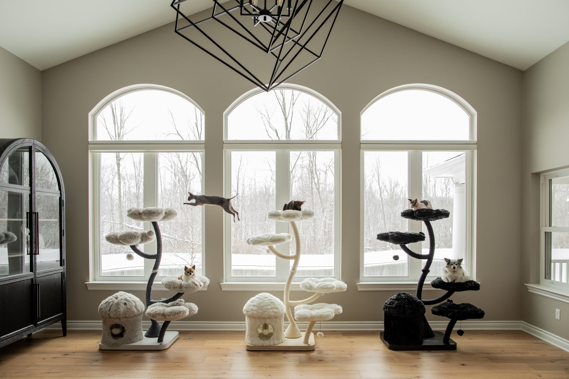 This modernized cat tree consists of four flower beds -varying appropriate heights ranging up to 63”- one enclosed, cozy, private mushroom house with a dangly pom-pom toy attached. Our products are designed and tested for adult cats, kittens, and senior cats. ***Our cat trees are the BIGGEST on the market, offering spacious and comfortable amenities for even the most particular felines.
