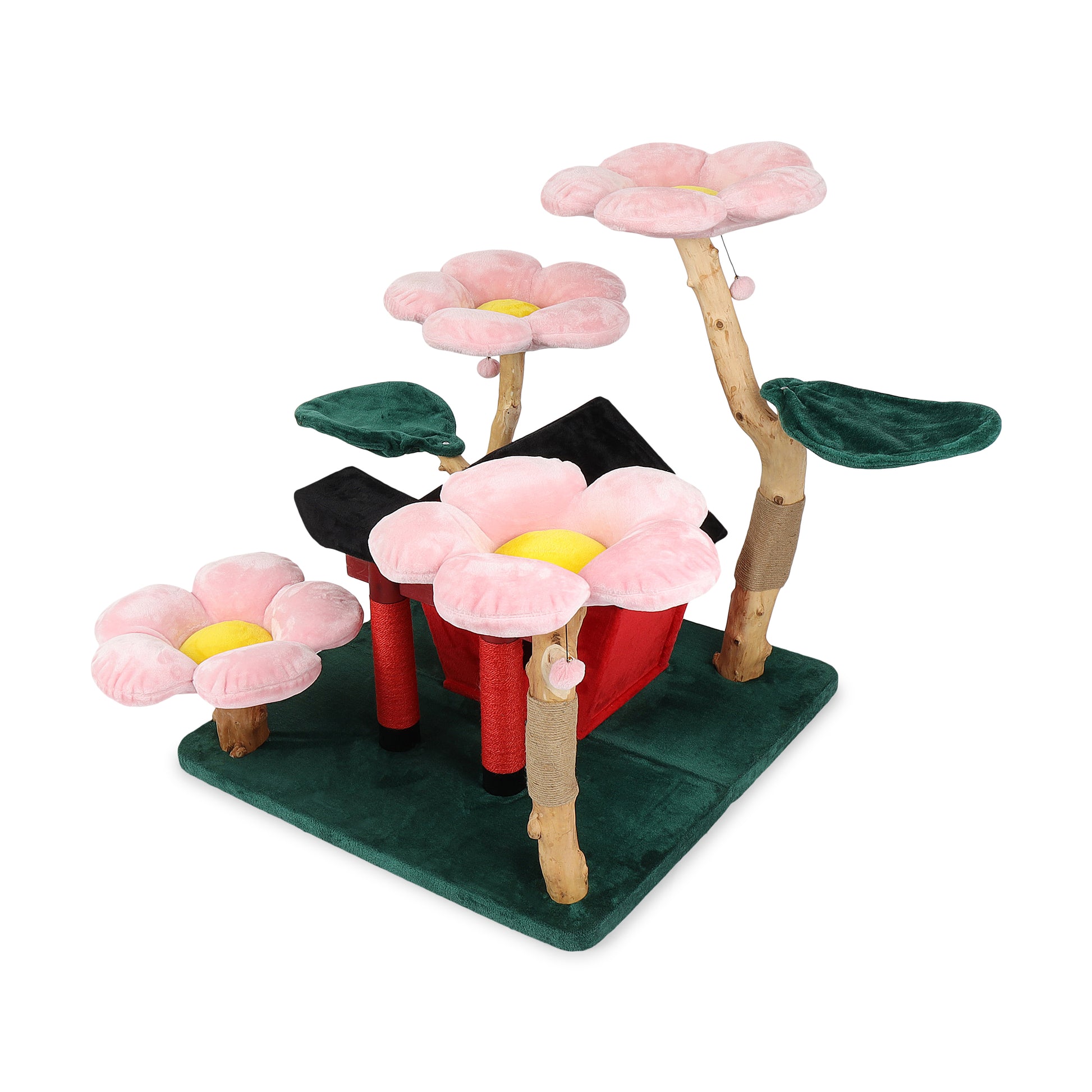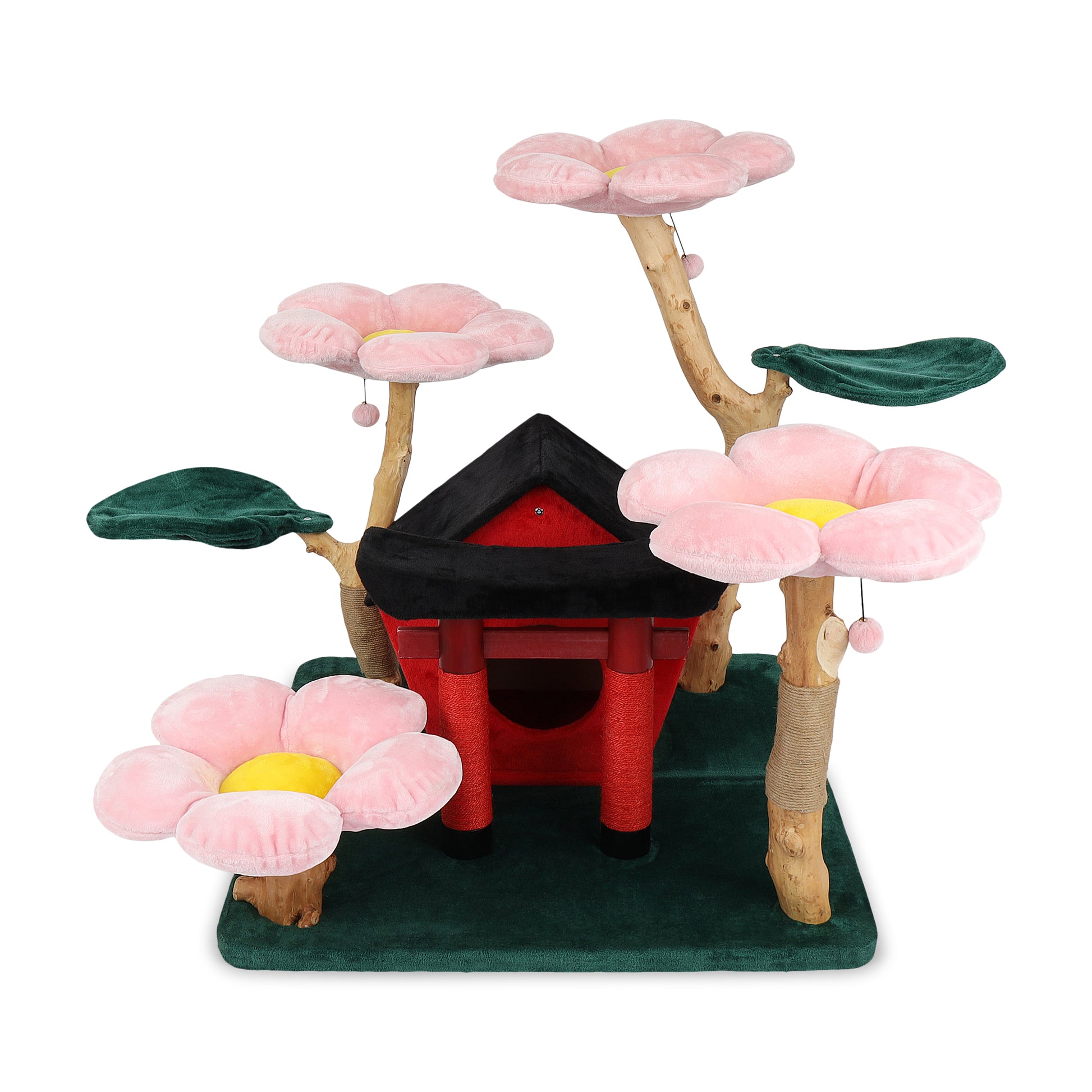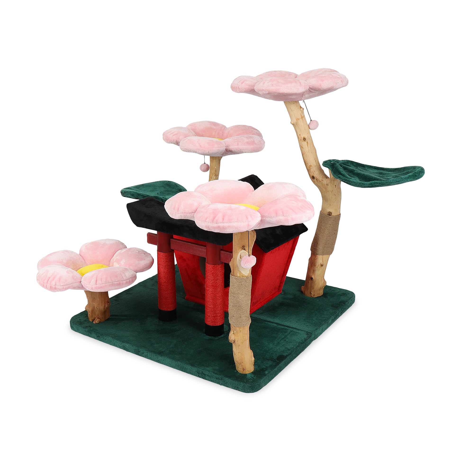 Features Unique Cherry Blossom design cat tree comes with a firm base plate to assure safety, four real naturals, treated tree branches partially wrapped with sisal rope, a comfy private condo, and four dangly plush toys with bells. It's suitable for cat resting, climbing, and playing—definitely, a great alternative for leaving your kitten alone without it damaging your furniture. Your lovely cat can scratch the hemp rope post, play with the pom-pom toys, and have fun while leaving your sofa and tiles free of scratches.
